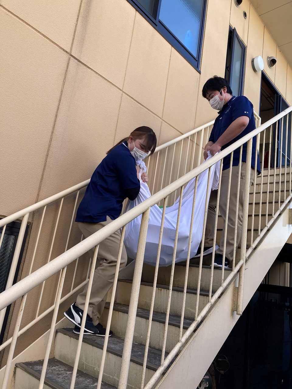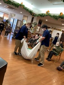 45㎏の想定で重さを計り水のペットボトルをシーツに包み、スタッフ2名で歩行困難の方を運ぶ訓練を実施しました。